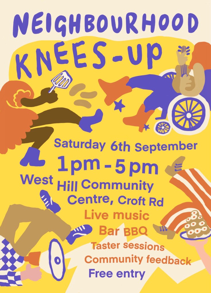 | Live music from local musicians! BBQ! Bar! Simple activities for kids! Tasters! Community consultation! Summer is about to finish, school is about to start again, but weāve got one last hurrah in us before the autumn sets in. Weāre delighted to bring to the West Hill a jolly old neighbourhood knees-up featuring local musicians, young and not so young. Come and grab a burger or hot dog (vegan options available). Weāll also be running a bar outside with wine, beer, and non-alcoholic beer. And inside you can get a cuppa or juice as always. Prices will be very reasonable (like, VERY reasonable for these days) because we want the whole community to enjoy a nice burger and a drink, together. So get it in your diaries: Saturday 6th September, 1-5pm. More details on our Instagram and Facebook. Weāll see you there! With love,The West Hill Community Centre TeamšÆāāļø š |